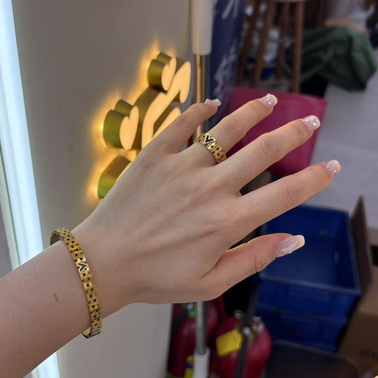 Gold plated open band bracelet with cutwork alphabets