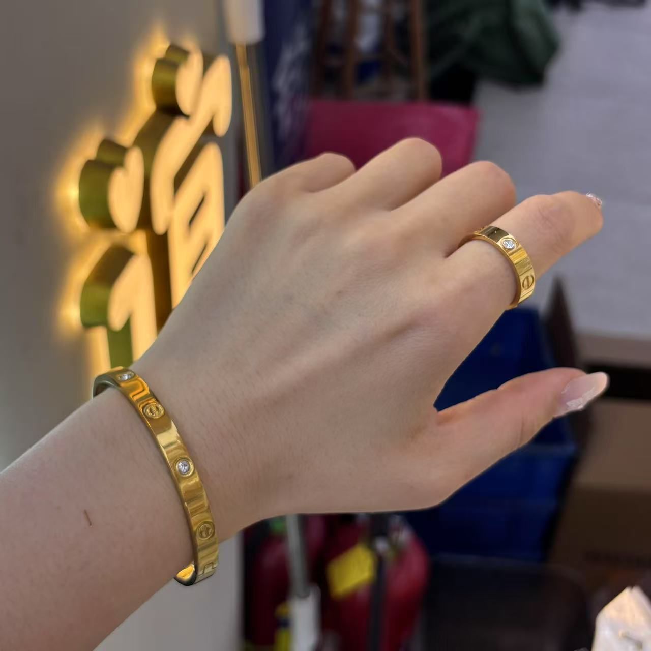 Stainless Steel Cross Nut Nail Design Crystal Charm Bangle Finger Ring For Women Gold Color Cuff Bracelet Jewelry Set Gift Party